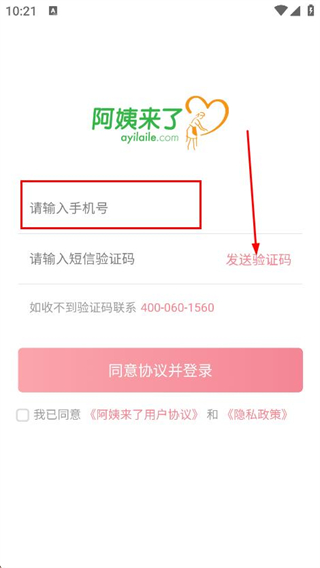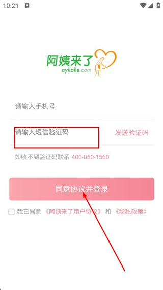 4、填入收到的验证码,点击同意协议并登录完成操作。