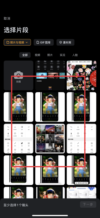 2、在选择片段界面,从照片与视频、GIF图库、素材库中,挑选要剪辑的素材,点击素材勾选,再点击下一步。
