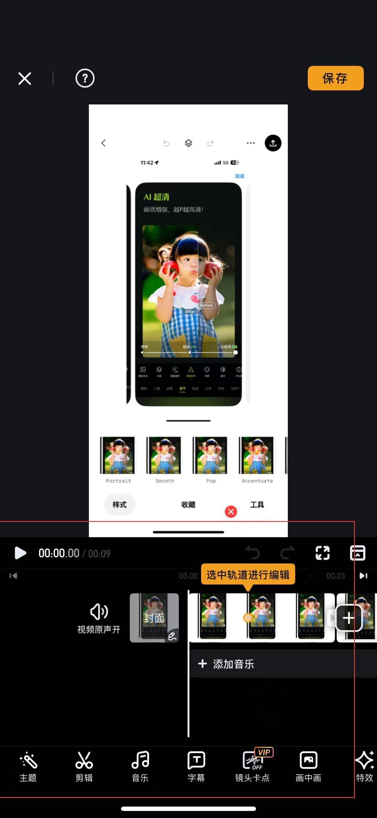 3、进入剪辑界面,利用底部功能栏,像剪辑裁剪视频,音乐添加配乐,字幕添加文字等;完成编辑后,点击右上角保存导出视频。