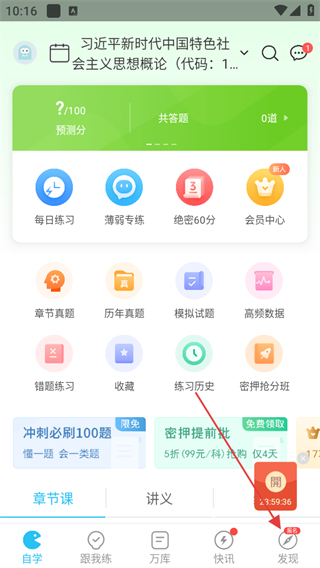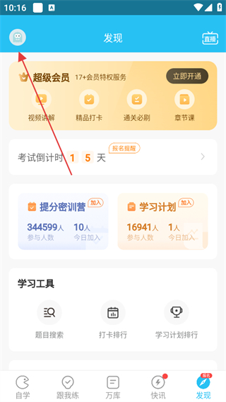 1、打开自考万题库APP,进入发现页面,点击左上角的个人头像。
