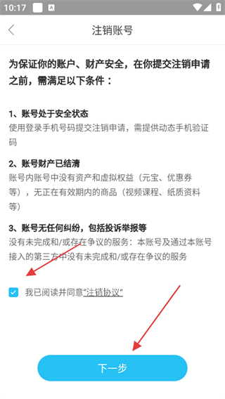 4、在注销账号页面,勾选我已阅读并同意注销协议,点击下一步。
