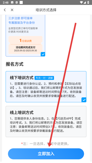 3、可以选择线下培训方式,选择好后点击立即加入,进行后续操作。