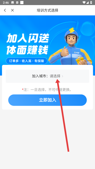 1、在登录成功后,进入培训方式选择页面,点击箭头指向处选择城市。