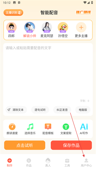1、打开配音鹅APP,点击底部导航栏用户中心,进入个人页面。