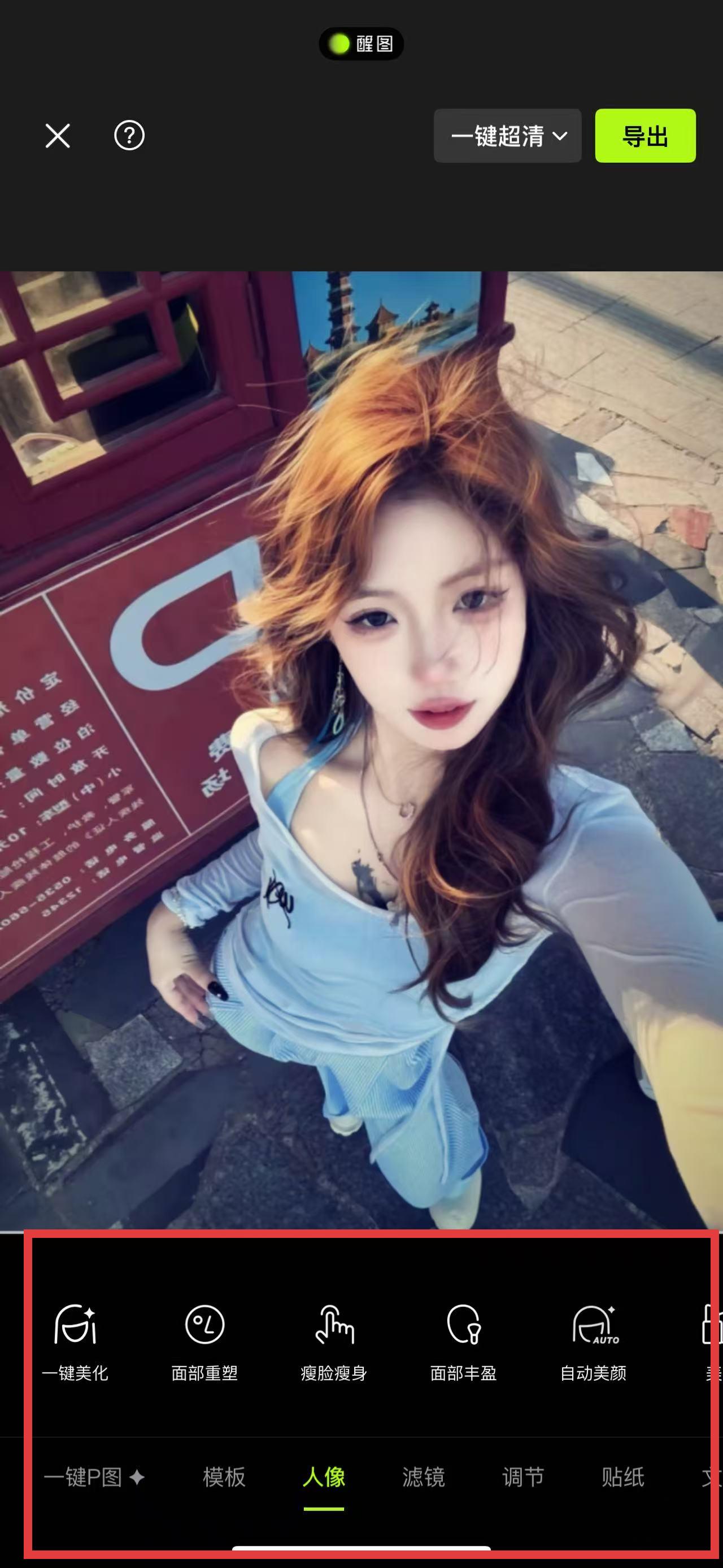 3、照片载入后,利用底部工具栏里的一键美化、面部重塑、瘦脸瘦身等各种功能对照片进行调整,完成后点击右上角导出保存P好的图片。
