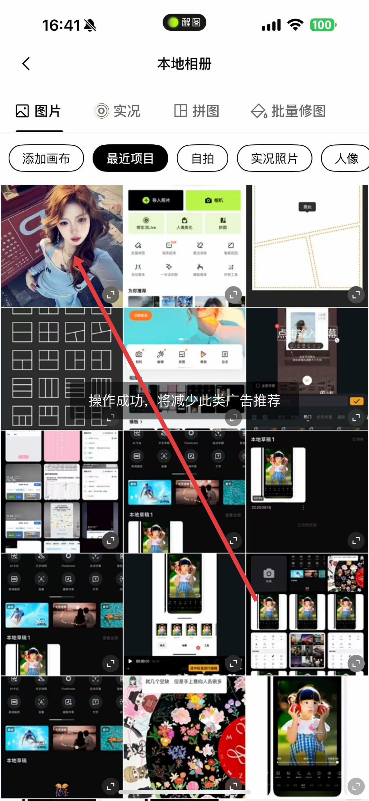 2、进入本地相册界面后,从图片分类里找到目标照片,点击该照片,即可将其载入醒图的修图工作区。