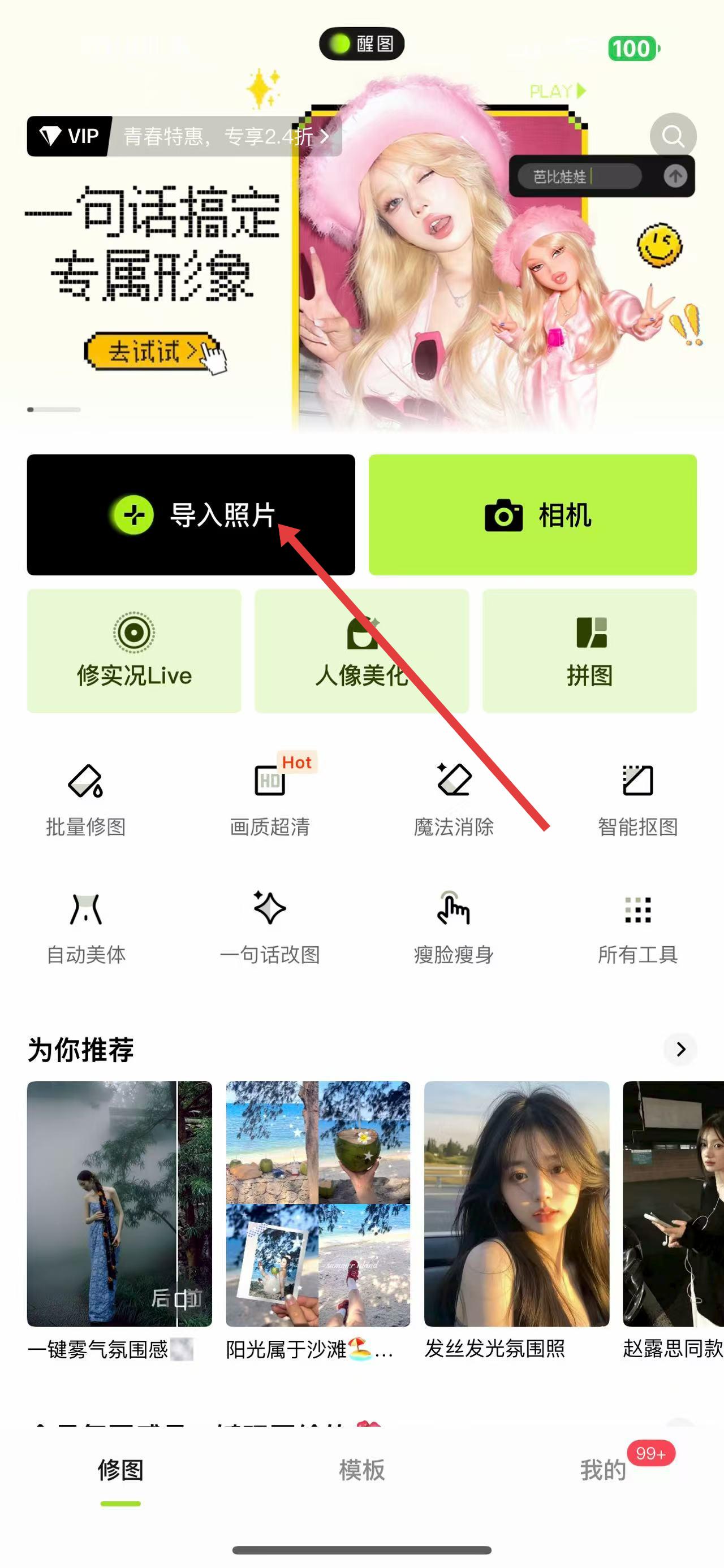 1打开醒图APP,在首页界面的上方点击【导入】选项。