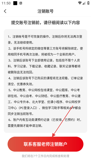 4、在注销账号页面,点击联系客服老师注销账户。