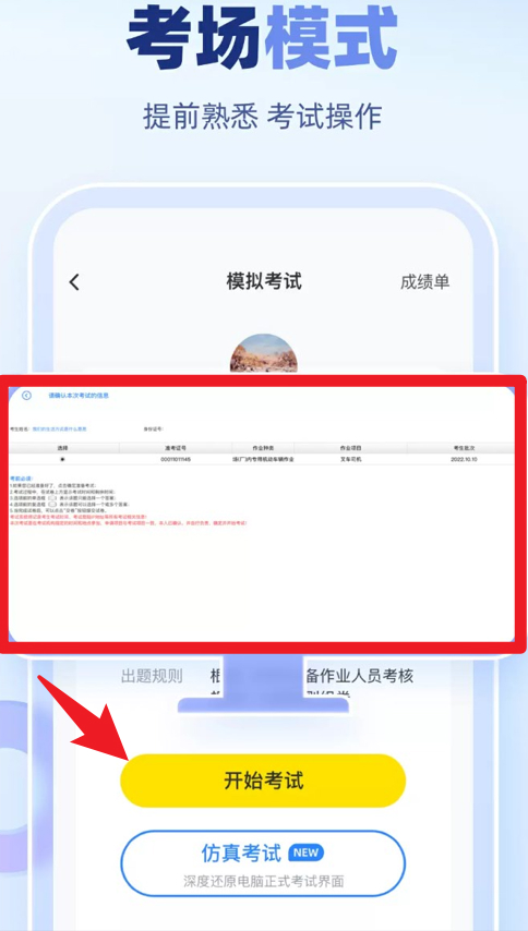 4、在考场模式中可进行模拟考试,提前熟悉正式考试界面与操作流程,点击“开始考试”即可进入模拟测验。