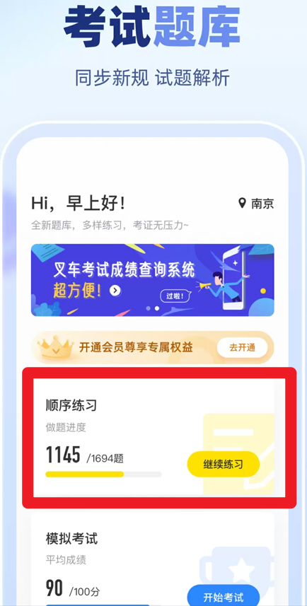 2、考试题库页面可选择顺序练习,系统会显示已完成题量与总题量,方便随时查看进度并继续答题。