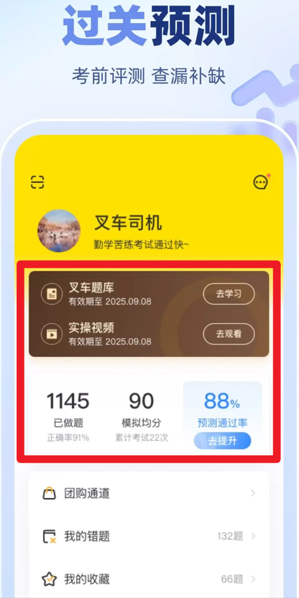 5、可查看学习进度、模拟考试次数与预测通过率,方便针对薄弱环节进行查漏补缺。