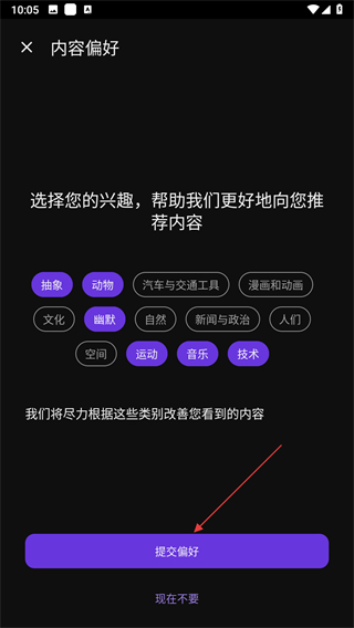 4、选好感兴趣的类别后,点击提交偏好,即可完成内容偏好的设置。
