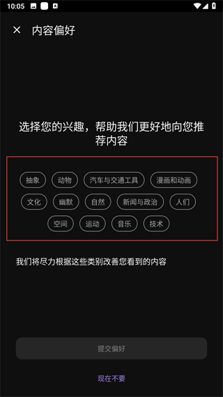 3、在内容偏好设置页面,选择自己感兴趣的类别,如抽象、动物、幽默等。