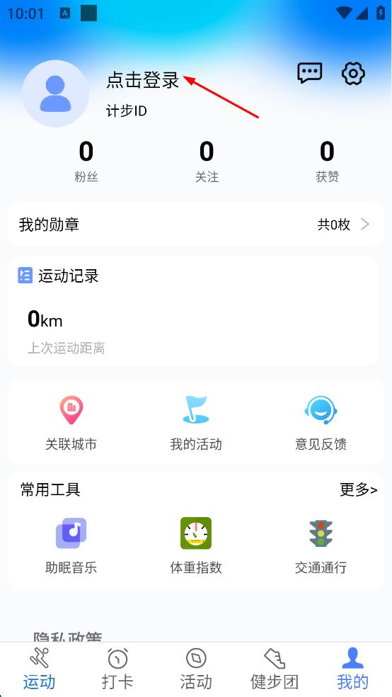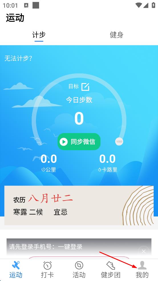 1、打开健康运动计步器软件,进入运动界面后,点击界面下方标注“我的”的图标,进入个人页面。
