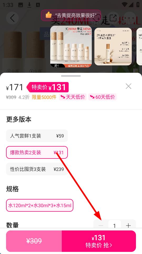 3、在商品详情页下方【更多版本】处,选择如【爆款热卖2支装】等合适套装,确认【规格】(如水120ml*2+水30ml*3+水15ml)无误后,点击“+”“-”调整【数量】,再点击【特卖价-抢】,即可将商品添加至购物车。