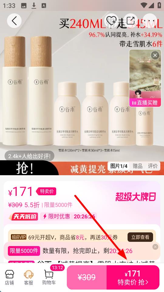 2、进入商品详情页,查看【谷雨】爽肤水的优惠力度,如【特卖价-¥171】,相比原价【¥309】打5.5折,且【限量5000件】,还有“买240ML带走345ML”等优惠。同时关注【2.4k+人给出好评】等用户反馈,确认商品符合需求。