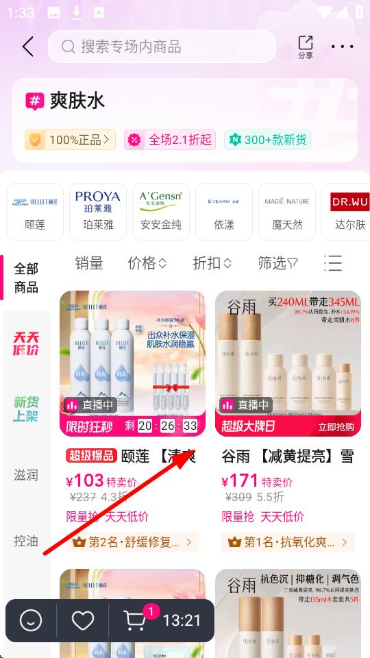 1、打开唯品会APP,进入【爽肤水】专场,在搜索框下方能看到“100%正品”“全场2.1折起”等标识。通过【全部商品】下方的【销量】【价格】【折扣】等筛选条件,快速定位目标商品,若商品处于【直播中】,留意【限时狂秒】倒计时,找到心仪商品后点击进入。