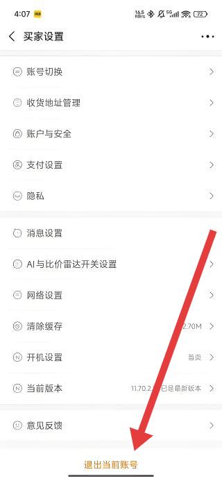 2、在买家设置页面下滑至底部,可以通过点击退出当前账号按钮,唤起账号退出选项弹窗。