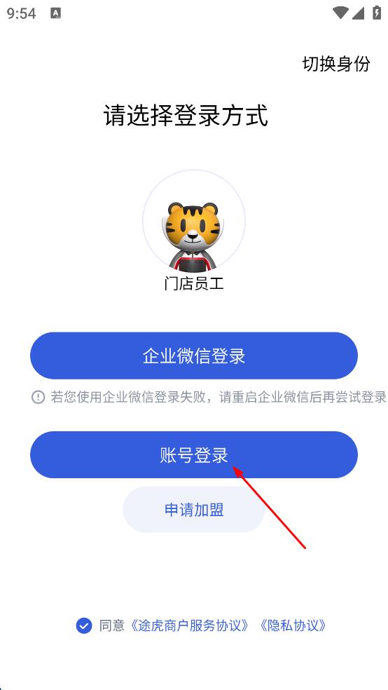 1、打开途虎商户版软件,进入登录方式选择页面后,点击“账号登录”选项,进入账户密码登录界面。