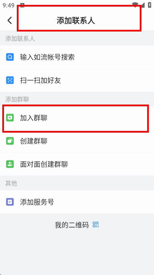 4、进入添加联系人页面后,点击加入群聊,然后可以通过输入群号、扫描群二维码等方式来加入对应的群聊。