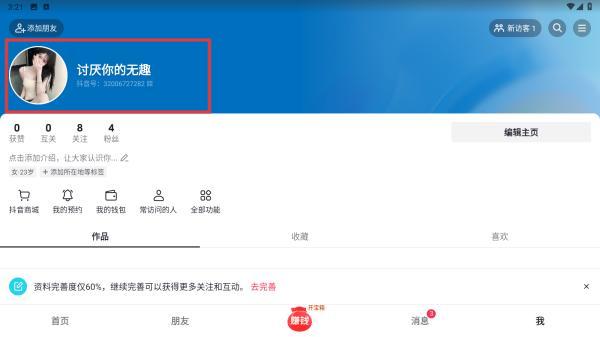 3、登录后,再点击我到个人主页中心,查看用户昵称、头像、抖音号是否显示,显示成功代表已登录。