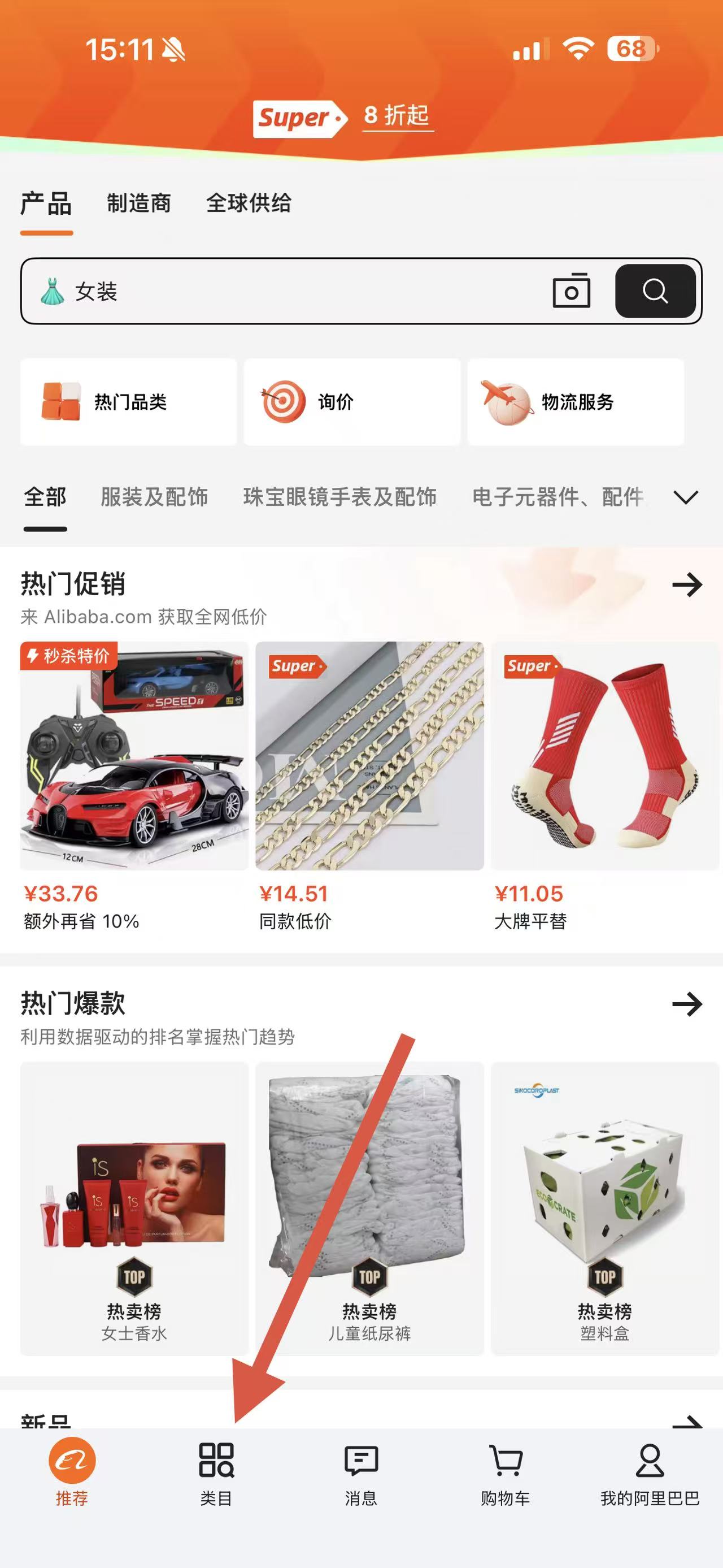1、打开阿里巴巴国际站APP,点击底部导航栏中的类目选项。