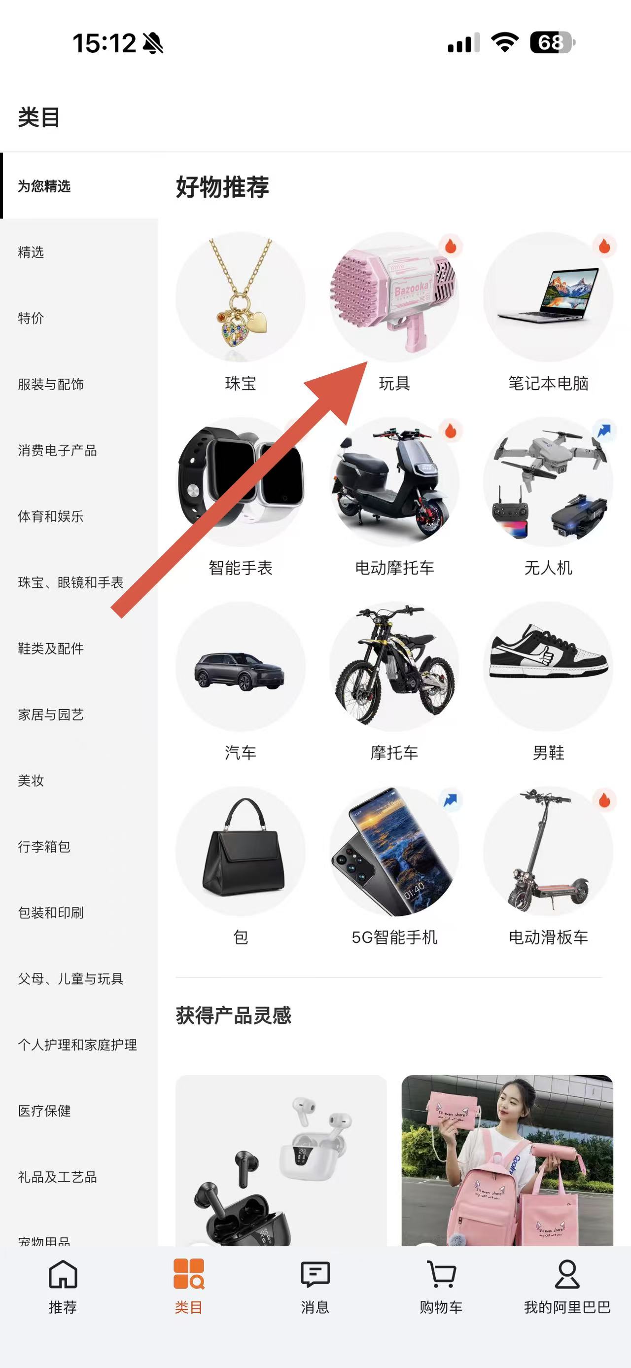 2、在类目页面,浏览并选择你想购买的商品类别,比如点击玩具。