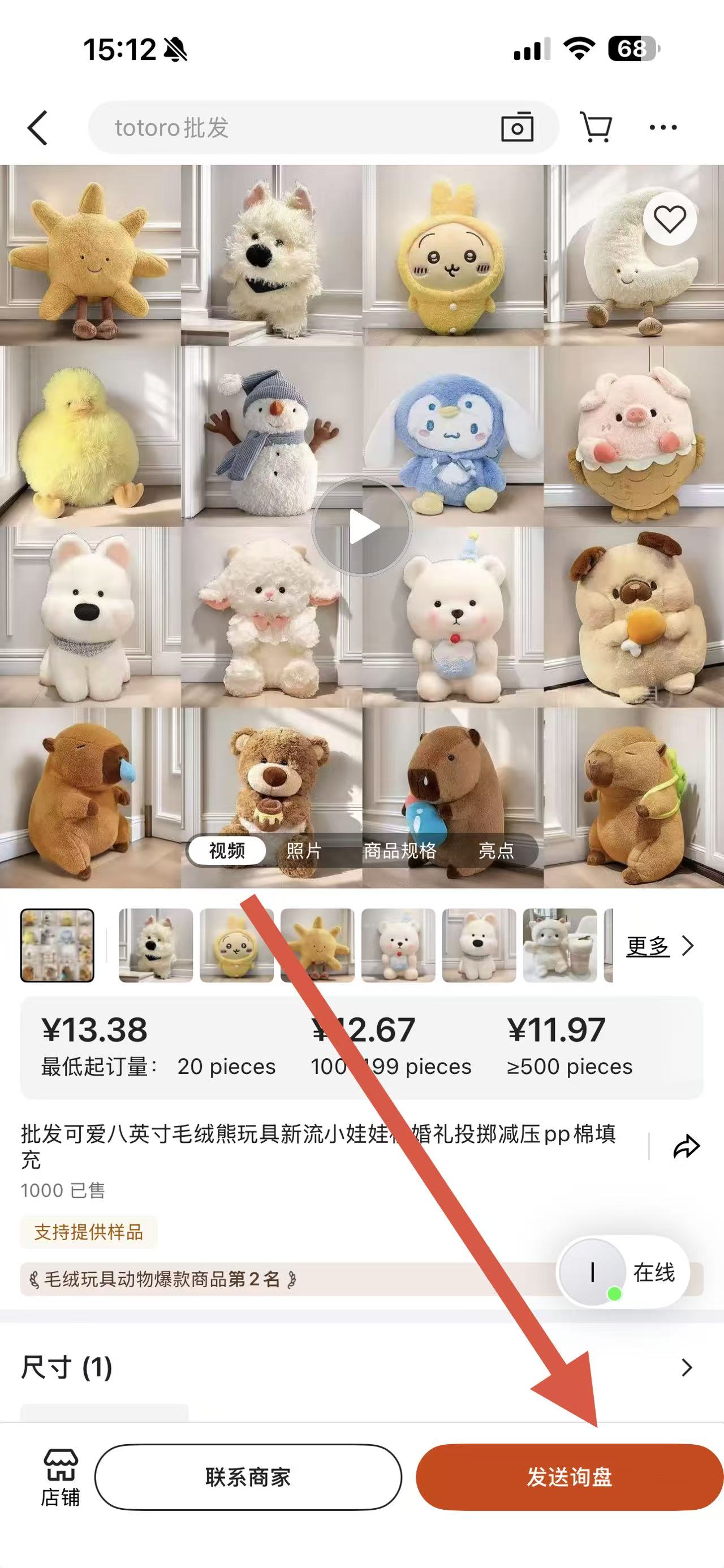 4、在商品详情页,确认商品信息无误后,点击底部的发送询盘按钮,沟通完成后按照商家指引完成下单购买。