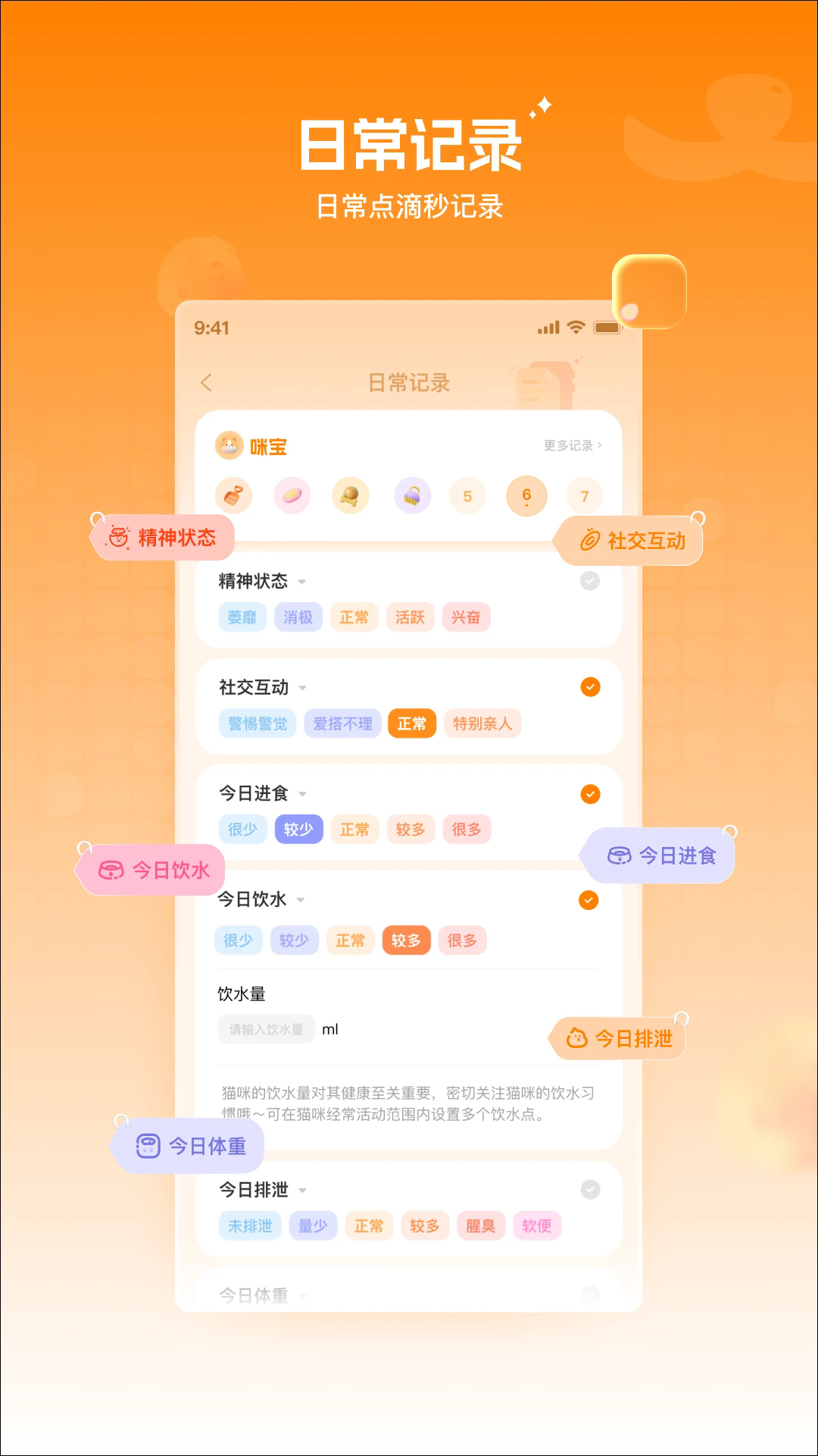 支持使用软件记录宠物的日常生活,能够记录宠物的喝水、饮食等;