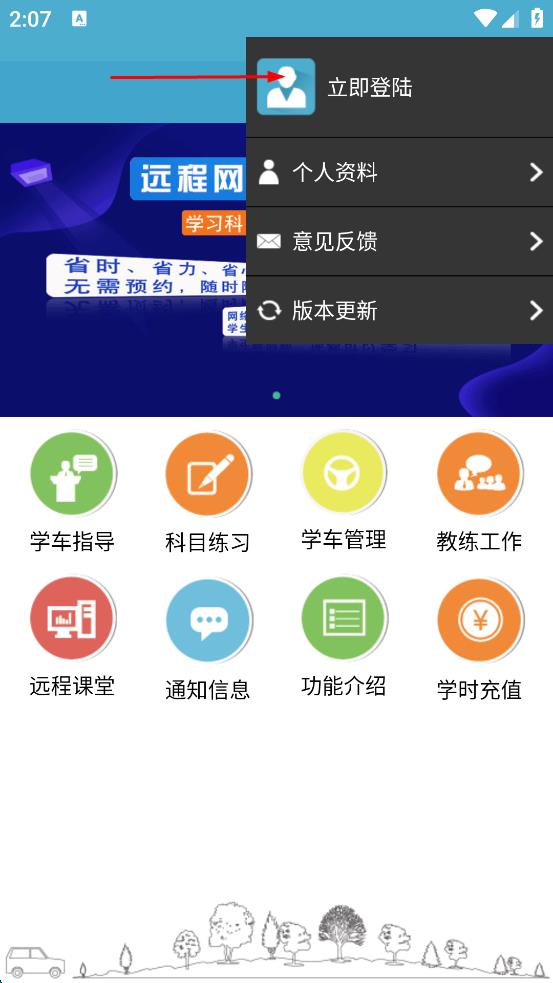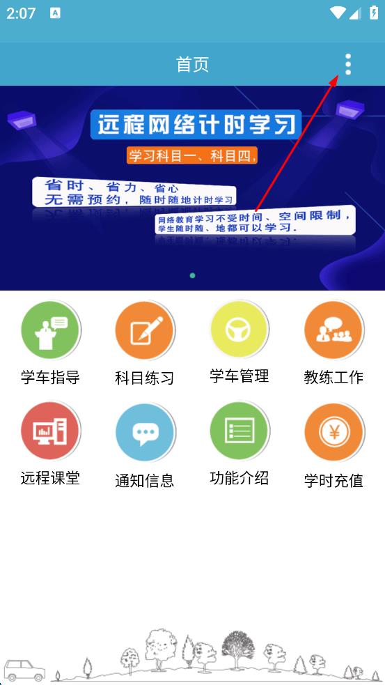 1、打开驾考学习软件,进入首页,看到有学车指导、科目练习等功能图标,点击页面右上角的三点图标,弹出操作选项。