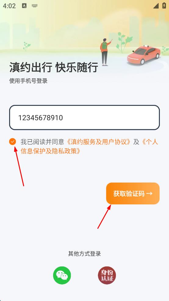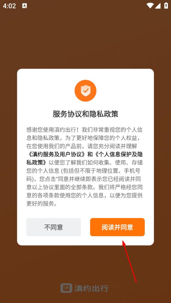 1、打开滇约出行APP,在弹出的服务协议和隐私政策提示框中,点击“阅读并同意”按钮。