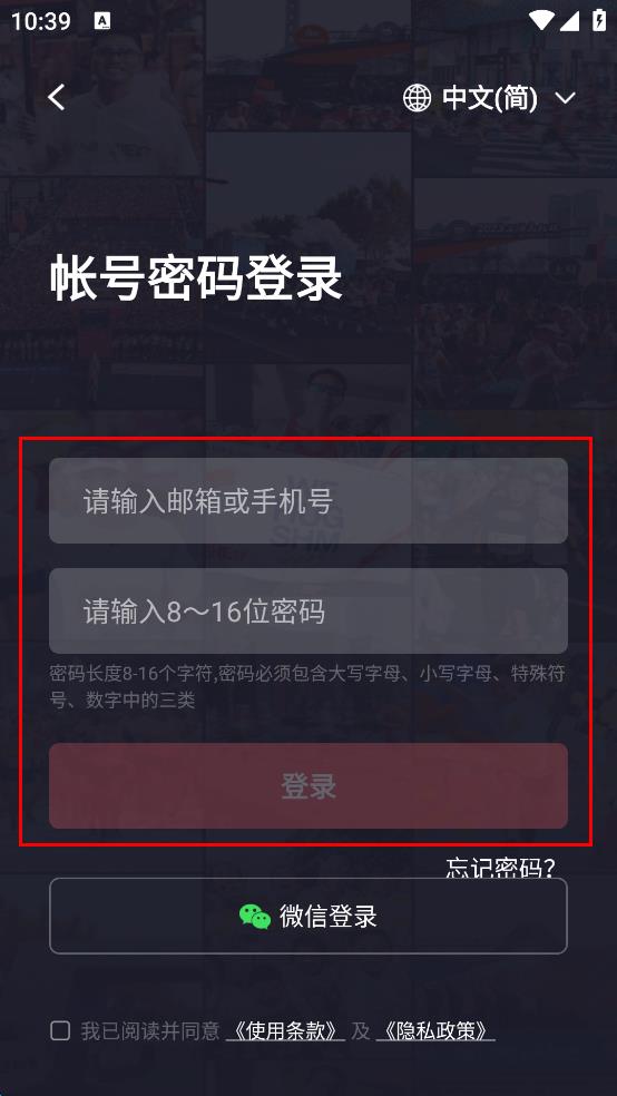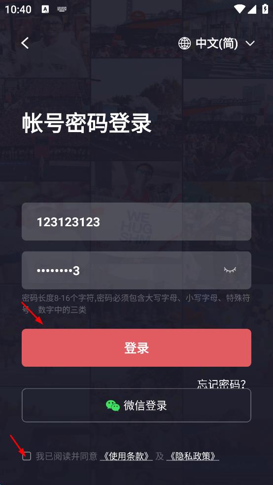 4、勾选我已阅读并同意使用条款及隐私政策前的方框,点击登录按钮,即可完成账号密码登录操作。