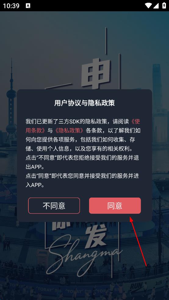1、打开上海马拉松APP,在弹出的用户协议与隐私政策界面,找到同意按钮,点击该按钮。