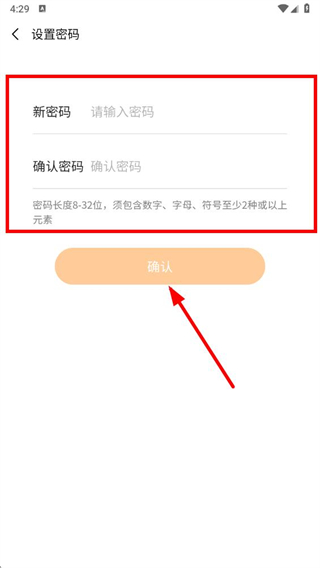 4、在设置密码页面,按要求输入新密码和确认密码,点击确认按钮完成密码设置。