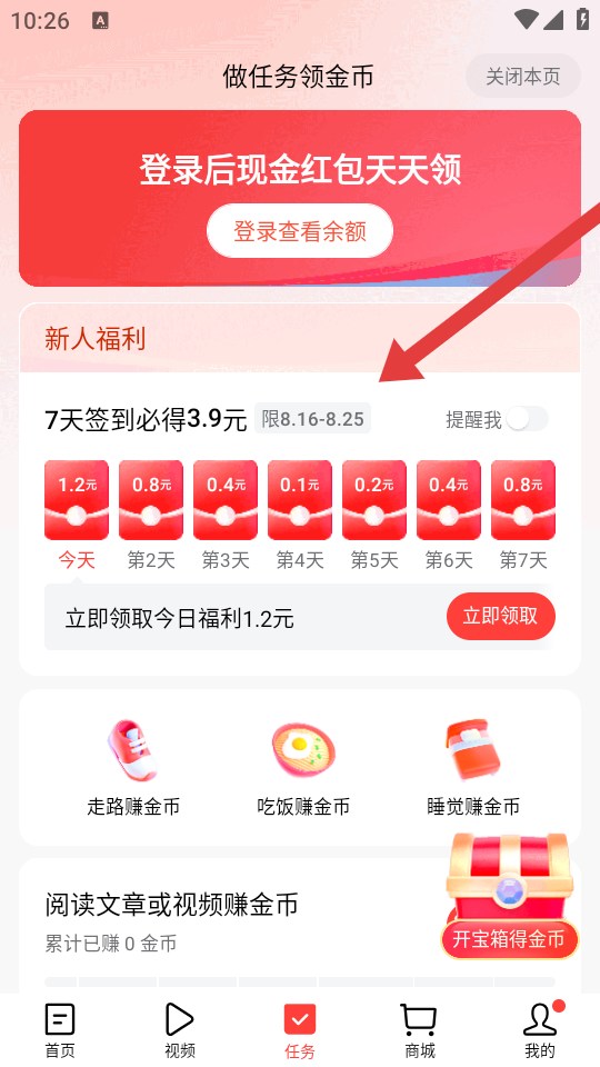3、进入今日头条安卓版app任务页面,参与7天签到必得3.9元等新人福利活动,完成任务领取金币或现金奖励。