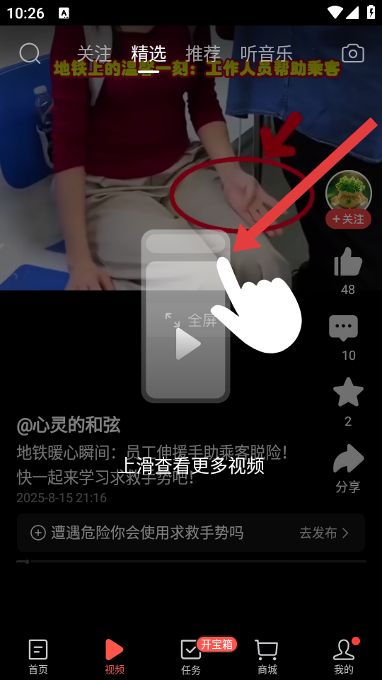 2、在第二个视频栏目的界面,上滑屏幕查看更多的视频内容,可以浏览不同创作者发布的视频。