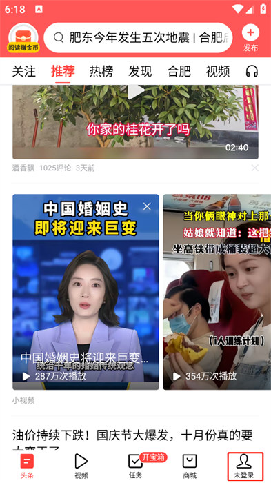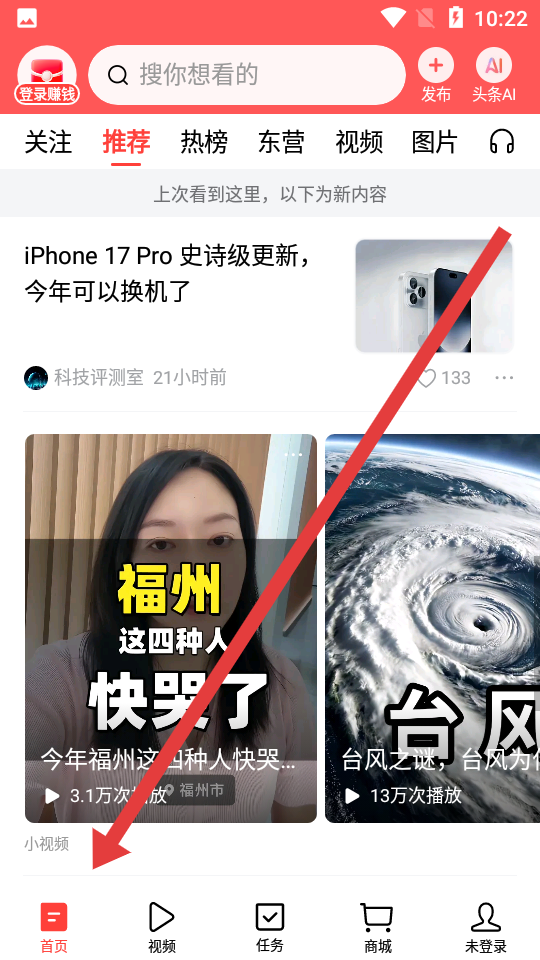 1、点击今日头条安卓版app怎么使用教程底部首页,进入推荐内容页面,浏览资讯、小视频等各类信息。