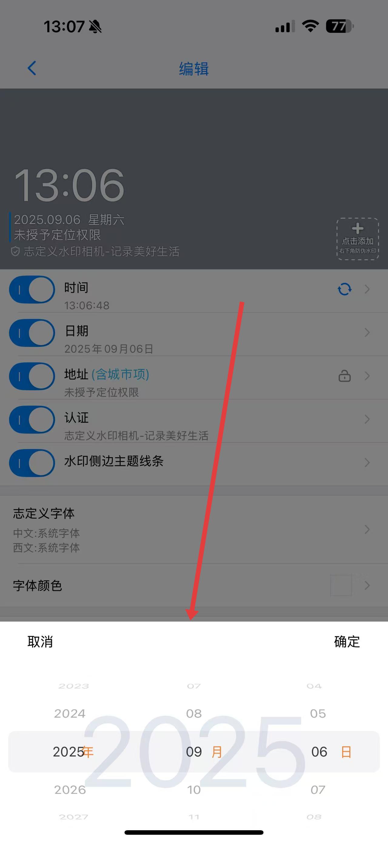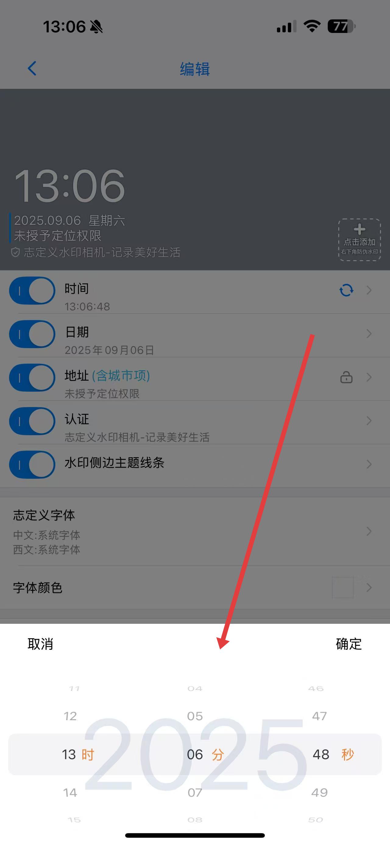 3、点击相机界面的编辑水印按钮,进入编辑页面后点击时间选项,通过弹出的时间选择器修改时间。