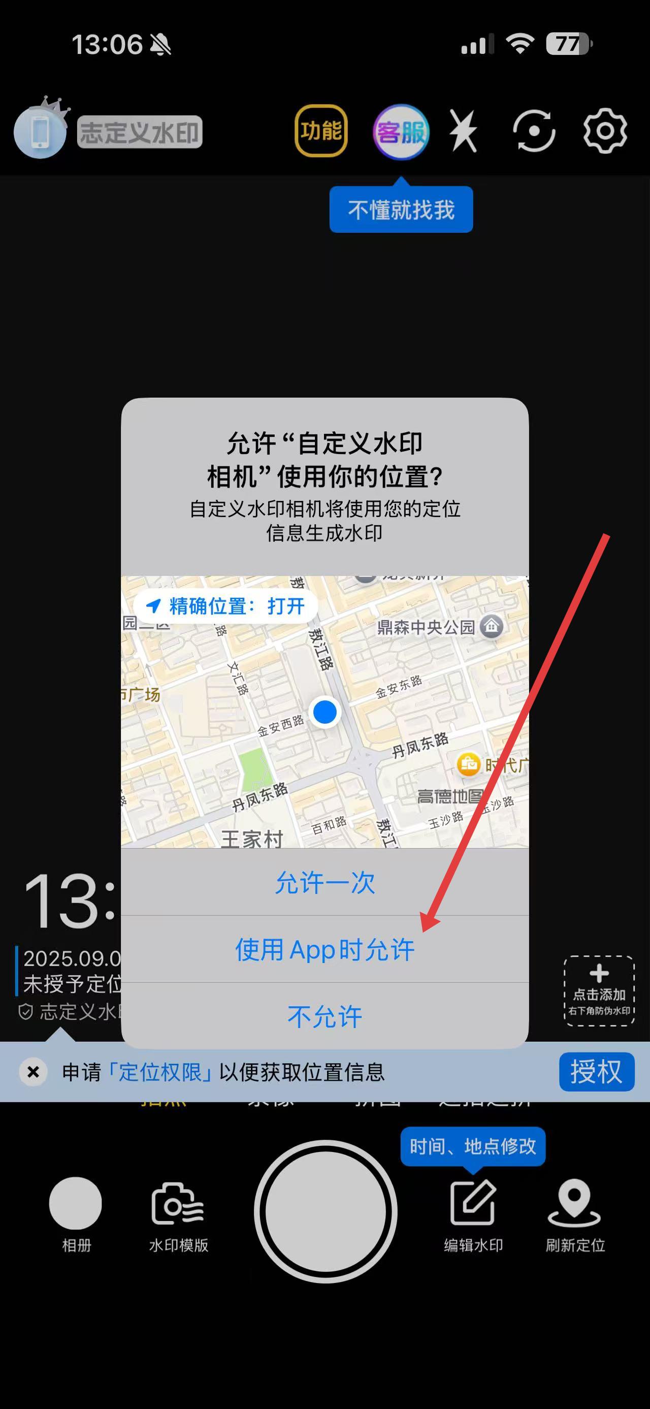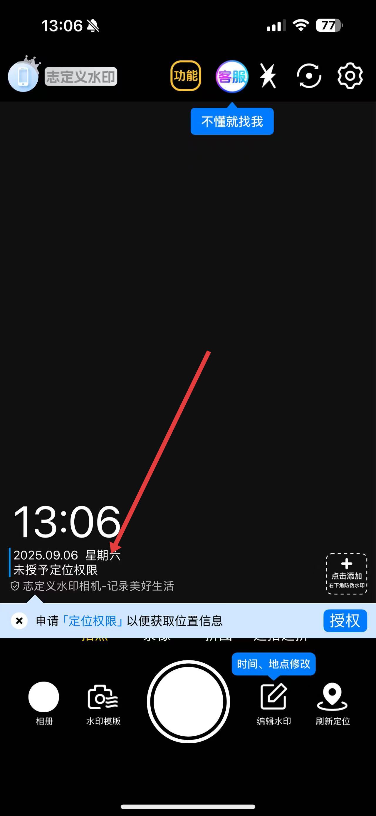 1、打开自定义水印相机,点击界面中申请定位权限以便获取位置信息的授权按钮。