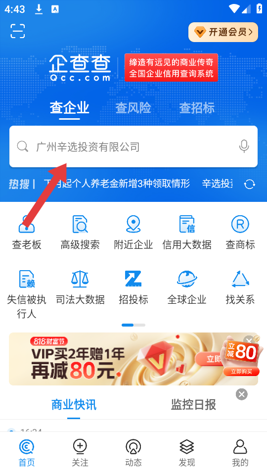 1、打开企查查APP,在首页搜索栏输入自己需要查询的企业名称如网易杭州网络有限公司,点击搜索启动查询。