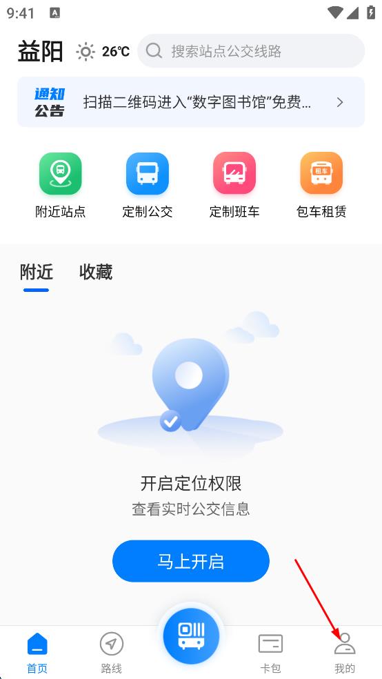 1、打开益阳公交软件,进入首页后,点击页面右下角的“我的”选项。