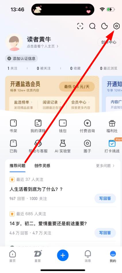 1、点击知乎我的页面右上角设置图标进入设置界面。