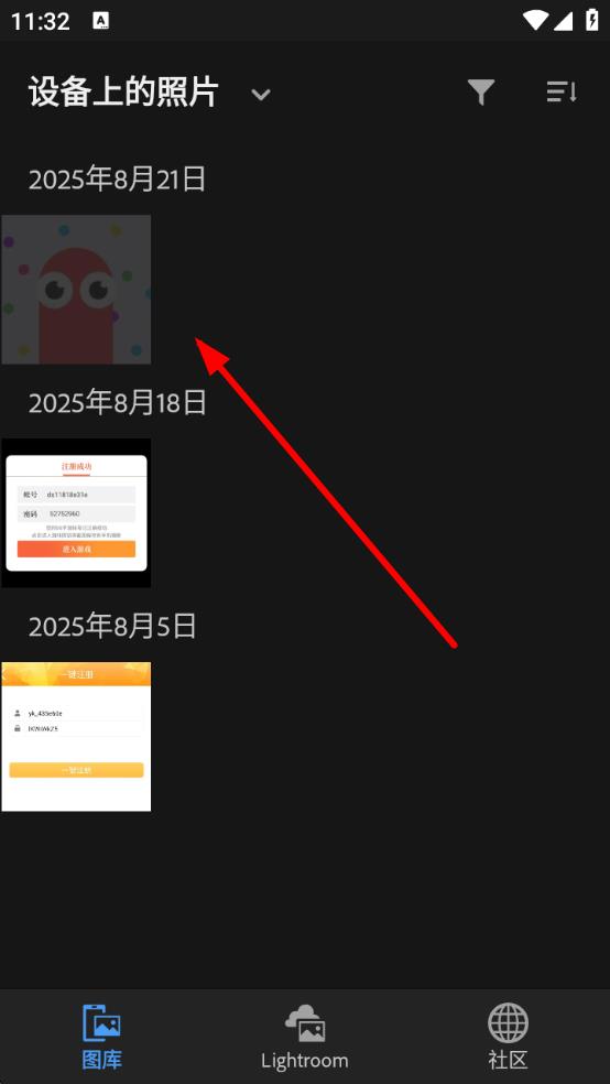 1、打开lr软件进入图库,在设备上的照片里找到要编辑的照片并点击打开。