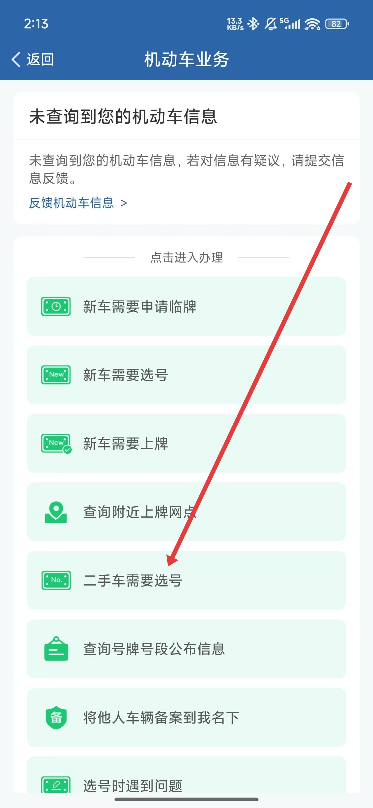 3、在点击机动车业务下的二手车需要选号业务,为二手车办理选号业务。