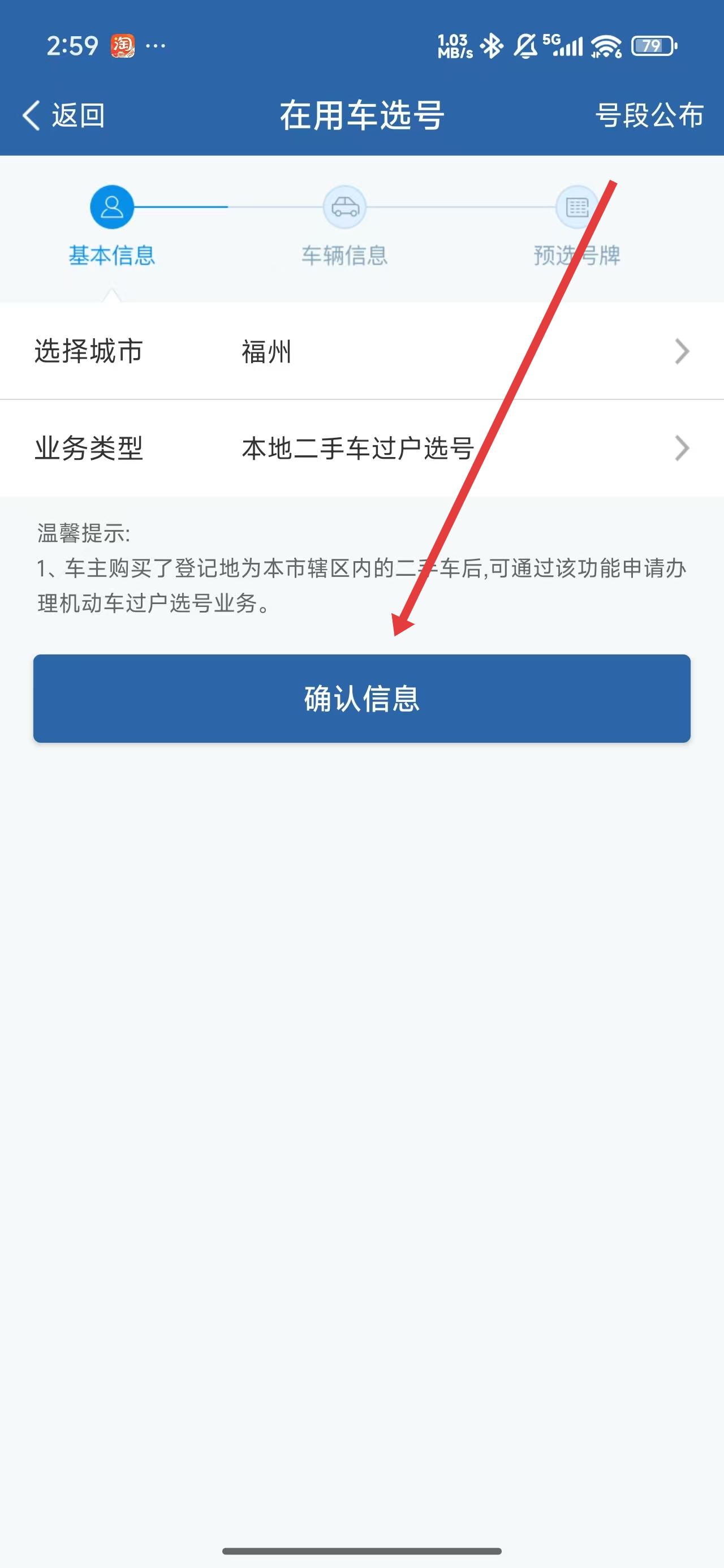 4、在进入到选号页面后,在确认完信息后,可以点击确认信息按钮继续后续操作。