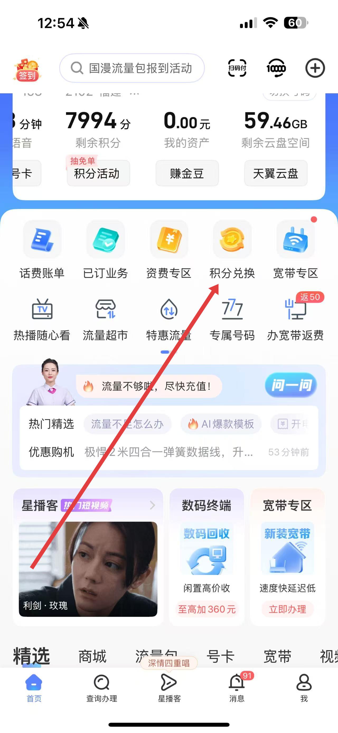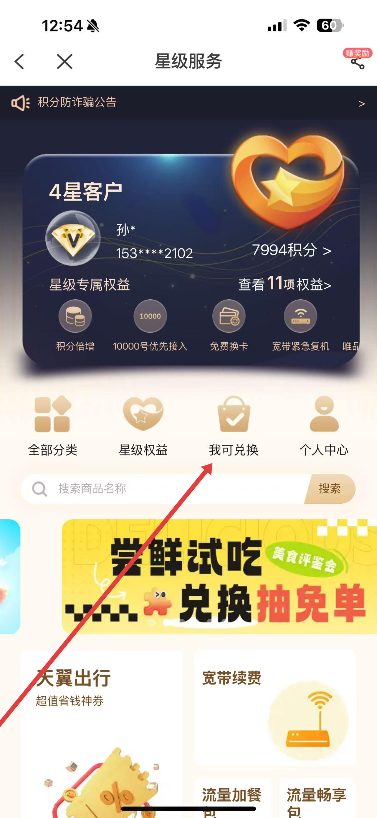1、打开中国电信APP,进入首页,在上方功能区找到并点击积分兑换选项,进入星级服务页面。