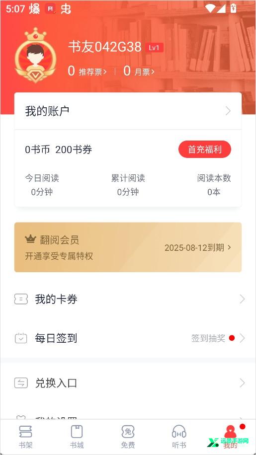 我的页面集成账号信息、卡券、阅读历史、签到福利等所有个性化服务。
