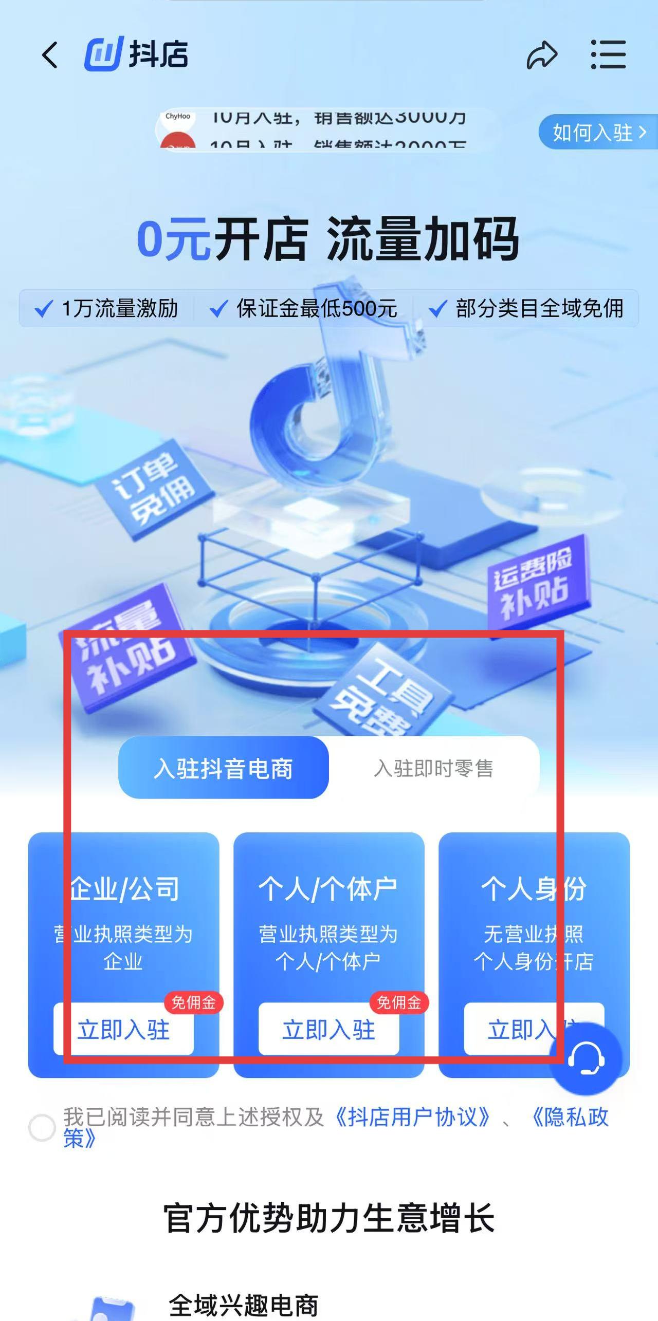 2、在抖店页面,根据自身资质企业/公司、个人/个体户、个人身份 ,选择对应入驻类型,如个人/个体户点立即入驻,按提示提交资料。