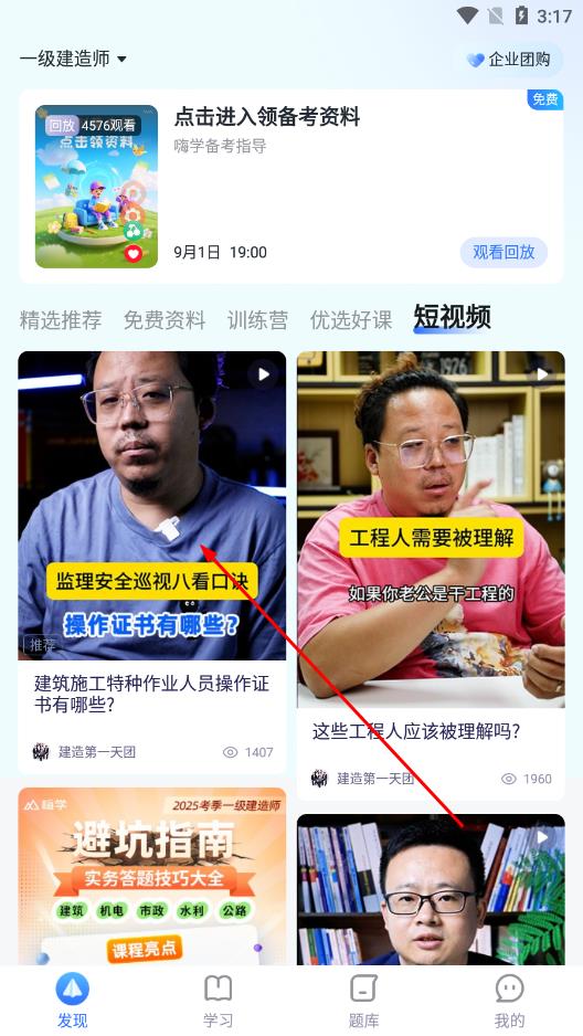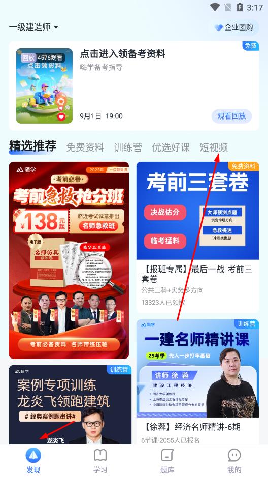 1、打开嗨学课堂App,进入首页后,在精选推荐板块中,点击短视频选项。