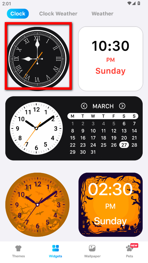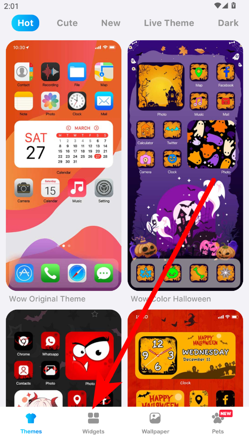 2、在主题界面中,点击底部的Widgets小部件选项,浏览各类小组件。